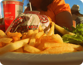For months now we have been planning a vacation to sunny So. Cal to take the kids to Disneyland. Last week all the planning finally paid off. It was a group effort, all together there were 4 kids and 6 adults, my family, my sister and her family and my mom and dad. This was our first real family vacation together in a long time and it was not without it's own set of difficulties, food poisoning being the worst! However, I will not talk about that, at least not today! Today I will remember that first day, the day we went on an airplane, got our feet dirty in the sand and enjoyed a delicious juicy hamburger!