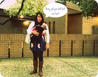 Feeling semi-successful we checked out and began to leave. We got to the parking lot when the following happened, my son had pooped, I had to pee (really bad) and I could not find my car keys meanwhile Henry's playing with a dirty McDonald's cup he found by our car. With Lucia strapped to me, Henry in my hand a book bag and diaper bag around my neck, I quickly rushed back into the library and into the restroom. I nearly peed my pants, Lucia still strapped to me as I'm bent over the toilet, bags on the ground in the cramped stall and Henry trying to get into the "feminine" waste basket and crawling on the dirty floor into the stall next to us. I apologize if that's too much information, but other parents will more than likely get me and those without kids, perhaps this will shed some light on what it can really be like at times.
