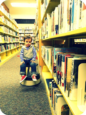 He's such a good boy, he tried his hardest! I had to pull him off a couple of shelves and "shhh" him a couple of times. I had to explain to him that I could not stop and take a picture of him down every aisle when he would loudly yell, "take a picture to me mommy! take a picture!" I had to give an apologetic look to the librarians while he pulled the books off the shelves and then put them back in the wrong place (no respect for the Dewey decimal system!). When we got the children's area, I had to convince him that the Dinosaur book was much better than 'Cooking traditional Native American Cuisine' (which he found in the cooking aisle and carried the entire trip, referring to it as "my book")