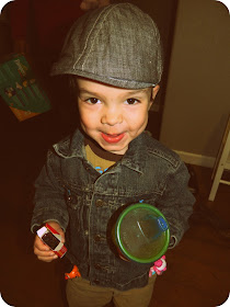 Today we learned that sometimes you can't do it all, hold your juice, eat your raisins and play with your toys. Unless you are a resourceful fellow that knows how to make use of his pockets...