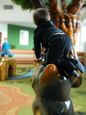 The rain, massive hail, thunder and lightning all thwarted our hopes to play outside yesterday. Still, needing to get out of the house for a bit, we decided we'd do something we rarely do as a family and headed to the mall! It's really a nice rainy day adventure, we were able to get our oil changed, search for new glasses for Steve and play. It kept everyone pretty happy...