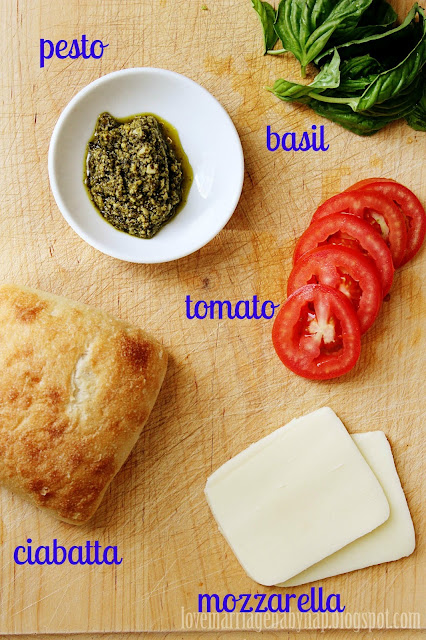 One of my favorites and easy peasy! You've got your bread, slice it, place about 1 tbsp of pesto on each side. Layer in the following order: bread, mozzarella, tomato, basil, mozzarella, bread. I suppose if you're feeling a little 'crazy' you could switch the batting order, either way it's a home run! (did you like my baseball analogies dad?)