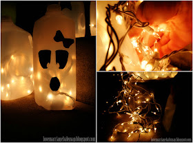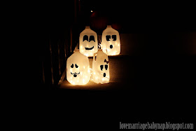 It's fun having kids. They're new here. Sometimes I'll pull out some old little trick or game or craft, and they just look at me, like I'm a genius. I'm a pretty impressive mommy...at least in their sweet little new minds I am. Last night I pulled out a classic. Very simple, cost me nothing and if you're striving for a hipper approach, very green! We made milk jug ghosts for the porch. We have a lot of milk jugs in our recycling, it's ridiculous how much milk we drink. Everything else I used was already on hand, black paper, Christmas lights. I was even able to get them involved, I cut the little eyes and mouths out and then Henry would put the face on the jug. Then when we put the lights in them and let those little ghost glow...I think I heard someone gasp in awe (okay, it may have been in me), but still they were pretty impressed...